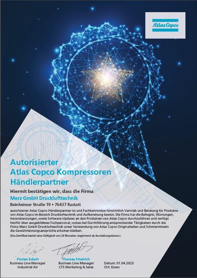 Die Merz GmbH Drucklufttechnik ist autorisierter Atlas Copco-Händlerpartner. Atlas Copco Kompressoren bestätigt mit der erneuten Zertifizierung, dass Firma Merz GmbH Drucklufttechnik Fachkenntnisse hinsichtlich Vertrieb und Beratung für Produkte von Atlas Copco im Bereich Drucklufttechnik und Aufbereitung besitzt. Wir haben die Befugnis, Wartungen, Instandsetzungen, sowie Software-Updates an den Produkten von Atlas Copco durchzuführen und verfügen hierfür über ausgebildetes Fachpersonal, sodass bei Durchführung entsprechender Tätigkeiten durch die Firma Merz GmbH Drucklufttechnik unter Verwendung von Atlas Copco Originalteilen und Schmiermitteln die Gewährleistungsansprüche erhalten bleiben.